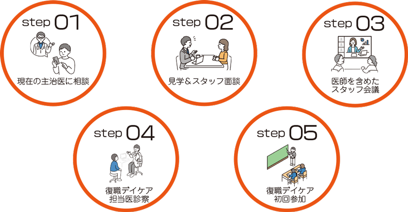 心身の不調により休職している人が復帰することを目指します。 復職支援のプログラムを通して、休職の原因となった症状や、ストレスの根幹をみていきます。 また、復職後の心身の不調や再休職を防ぐことも目的としています。